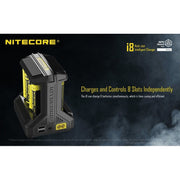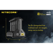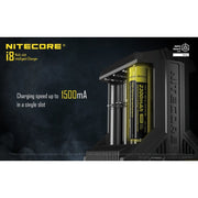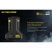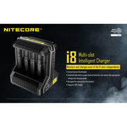Nitecore i8 punjač može istovremeno napuniti gotovo sve tipove baterija u 8 točaka punjenja. Sustav pojeinačno puni i prati punjenje svakeog od 8 utora. I8 automatski prepoznaje umetnutu vrstu baterije i određuje ispravni način punjenja (konstantna struja, konstantni napon, -dv / dt).Dvije dodatne USB utičnice mogu se koristiti za punjenje baterija vanjskih uređaja.ACD tehnologija omogućuje da i8 aktivno raspodjeljuje svoju snagu između 8 utora na uredan način. Ako npr. Kada je baterija gotovo potpuno napunjena, punjač će preusmjeriti dio svoje snage da napuni druge baterije.
