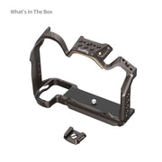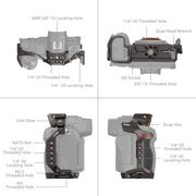 SmallRig Camera Cage Kit for Nikon Z 6III 4520 is designed to provide enhanced handheld shooting, portability, and accessory expansion. The kit includes a cage, an HDMI & USB-C cable clamp, and a top handle. The cage features multiple expansion options, such as 1/4"-20 threaded holes, 1/4"-20 locating holes, 3/8"-16 threaded holes, ARRI locating holes, cold shoe mounts, NATO rail, QD mounts, wrist/shoulder strap holes, allowing for the expansion of accessories like monitors, microphones, tripods, follow focuses, handles, and more for versatile video content creation across different scenarios. The cage securely locks the camera with a 1/4"-20 screw at the bottom and dual M2.5 screws on the sides. The ergonomic handle facilitates on-the-go shooting, providing a comfortable and stable filming experience. It is equipped with an HDMI & USB-C cable clamp that securely fastens with a simple twist of a thumbscrew, preventing accidental signal interruptions and ensuring stable signal transmission. Arca-Swiss quick-release plate on the bottom is compatible with Arca-type tripods (ID 4353, 4060) and DJI RS 2 / RSC 2 / RS 3 / RS 3 Pro/ RS 4 / RS 4 Pro gimbals, which allows for easy transitions between gimbals, handheld and tripod setups. In addition, a magnetic dual-head flat wrench is integrated into the baseplate for easy assembly and disassembly.