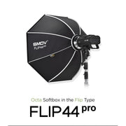 SMDV FLIP44 PRO je osmerostrani brzo sklopivi softbox promjera 110cm, namjenjen upotrebi sa studijskom fleš rasvjetom kao i malim bljeskalicama uz odkovarajući nosač adapter (kao GODOX S-type nosač).