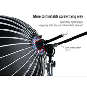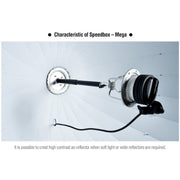 SMDV MEGA-110 DEEP je 24-strani brzo sklopivi parabolični softbox promjera 130cm. Mega Speedbox je potrebno koristiti sa "zoom focus" sustavom koji omogućava promjenu kuta raspršenosti bljeska.