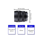 • Potpuna kompatibilnost sa Sony E fotoaparatima, uključujući stabilizaciju slike, izravni ručni fokus, MF pomoćni način rada, Eye AF i optičke korekcije.