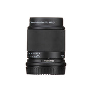 Manual focus, catadioptric telephoto lens with a fixed f/7.1 aperture that is compatible with select focus peaking camera systems and in-body, multi-axis image stabilization systems.