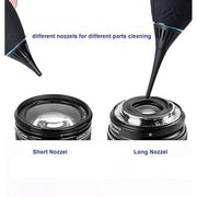 The package includes two different sizes of nozzles. The short nozzle is for the easily accessible areas such as the lens and the body of the camera. The long nozzle is for those hard to reach areas such as the sensor and the mirror of the camera.