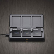 Odašiljači i prijemnik opremljeni su unutarnjim punjivim litij-ionskim baterijama koje traju cijeli dan. Mogu se puniti putem USB Type-C priključaka.