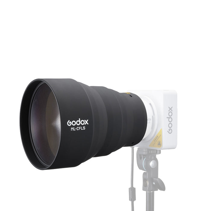 Novo predstavljen sklopivi Godox ML-CFL5 silikonski Fresnel usmjerivač za ML seriju bez napora se pričvršćuje na vanjsku stranu reflektora od 15° ili 36°, dodatno povećavajući svjetlosni tok ovisno o reflektoru.