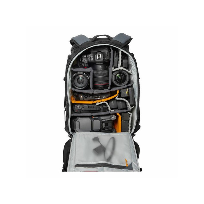 The ProTactic BP 450 AW III, part of Lowepro’s ProTactic III collection, designed for the demanding needs of the working photographer shooting events and other jobs all day and largely outdoors. Adapting day to day based on the location and subject. This backpack is built to adapt, offering four points of access to suit any scenario. It features dual side doors for quick access without taking the bag off, making it ideal for left-handed users as well. The wide top access is perfect for longer telephoto lenses, allowing you to get your setup in and out without opening the whole bag. Full back access provides comprehensive gear organization, perfect for assembled video rigs or just organizing your gear for the other doors.