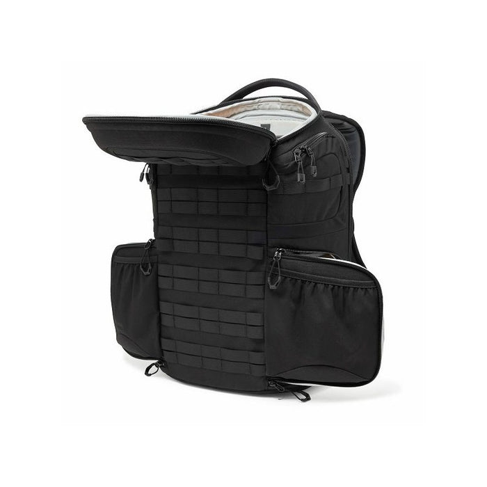 Inside the back door, you’ll find zippered transparent organization pockets on top of a CradleFit laptop pocket that fits up to a 14'' MacBook Pro. The side doors have large exterior stretch pockets that hold up to a 1L bottle and are reinforced at the bottom for tripod support. Additional loops and pockets on the top of the sides allows for quick access to items and secure tripod attachment. The backpack stands upright on its own, making it easy to handle and access your gear.