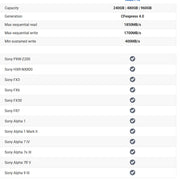 Podržava: VPG200 certificiran za rad sa svim Sonyjevim modovima fotoaparata i omogućava najviše dopuštene postavke u Sony Alpha, FX i FR7 fotoaparatima